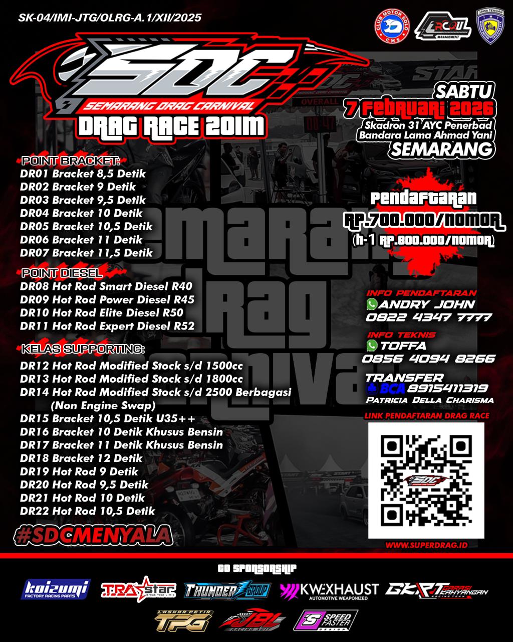 SUPER DRAG WAY - Khusus Kelas Bracket Time dan Kelas Superbike Komunitas Pembalap, Pihak Super Drag Way (SDW) akan melakukan pendaftaran murah yaitu 400.000 per pendaftaran, dengan maksud untuk memberikan kesempatan para pembalap tampil di event SDW Racertees Ekitoyama Saber White Series 2025.